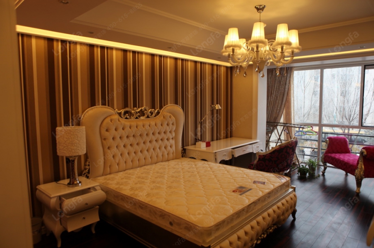 客厅的大部分处在挑空结构之下,大面积的玻璃窗带来了良好的采光,落地的窗帘很是气派。布艺沙发组合有着丝绒的质感以及流畅的木质曲线,将传统欧式家居的奢华与现代家居的实用性完美地结合。壁炉自然不可或缺,它被安置在空间结构的交汇处,与一幅色彩鲜艳的油画相呼应,敞开式的客厅提供了一个视觉中心。